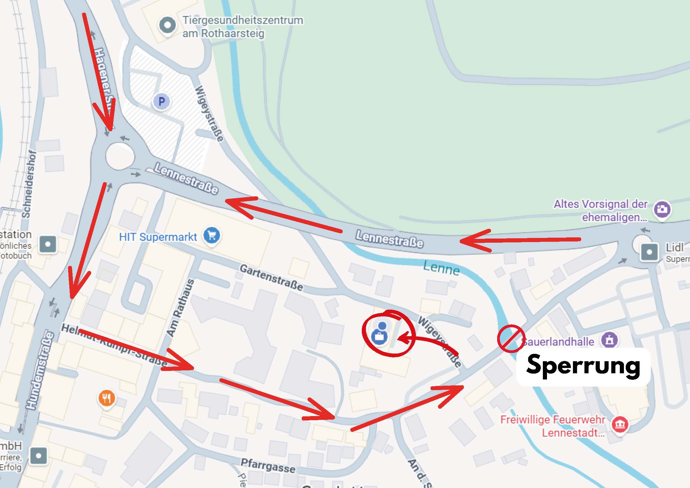 Aus Richtung Saalhausen folgt ihr der Umleitung in den Innenstadtbereich und folgt der Helmut-Kumpf-Straße bis zu uns zur Wigeystraße.